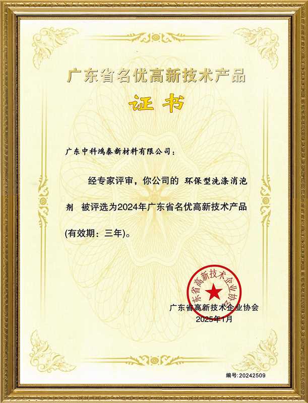 經(jīng)廣東省高新技術(shù)企業(yè)協(xié)會嚴格評審,廣東中科鴻泰新材料有限公司自主研發(fā)的“環(huán)保型洗滌消泡劑”與“改性有機硅消泡劑”兩款核心產(chǎn)品,成功榮獲“廣東省名優(yōu)高新技術(shù)產(chǎn)品”證書。這一權(quán)威認證,標志著中科鴻泰在消泡劑領(lǐng)域的技術(shù)創(chuàng)新實力、產(chǎn)品質(zhì)量水平及市場競爭力獲得了省級層面的高度認可。